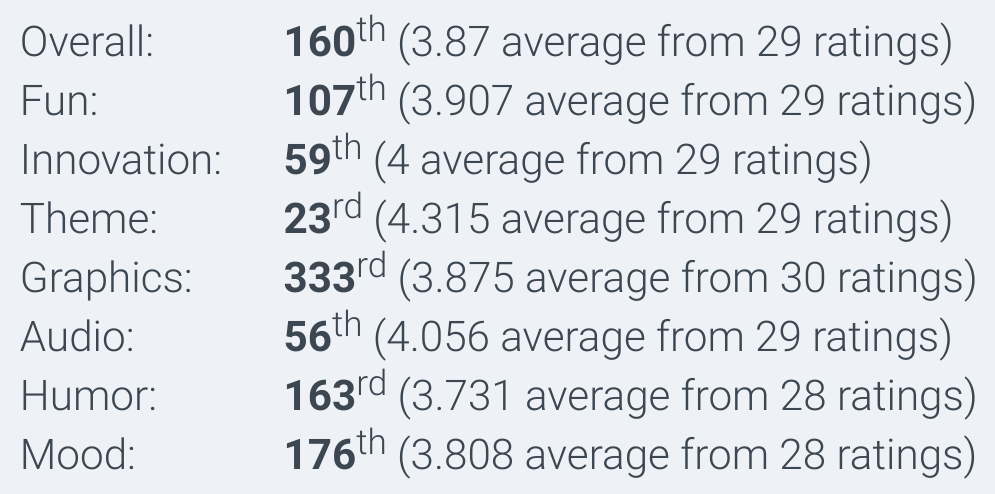 Results were pretty solid. We got a good Theme rating, and except for Graphics, our scores were all better than 200th place!